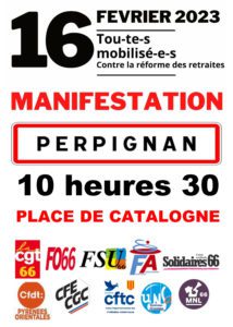 MOBILISATION 16 FÉVRIER – MANIFESTATION 10H30 PLACE DE CATALOGNE Tweeter Partager Partager Imprimer cet article Télécharger cet article 14 février 2023